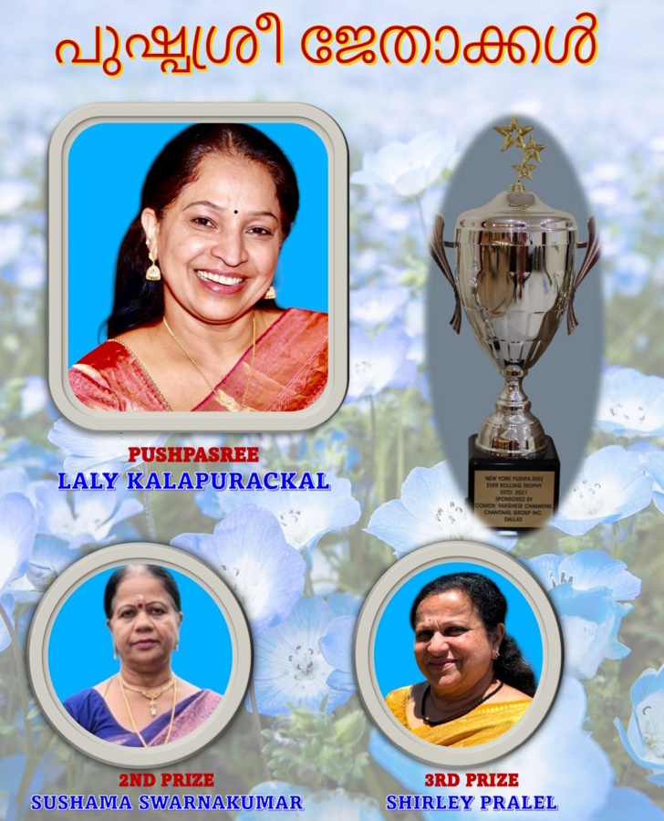 നേഴ്സായ സുഷമാ സ്വർണ്ണകുമാറിന് പുഷ്പശ്രീ രണ്ടാം സ്ഥാനവും, ഷേർളി പ്രാലേലിനു പുഷ്പശ്രീ മൂന്നാം സ്ഥാനവും ലഭിച്ചു. സുഷമ ബാബിലോണിലാണ് താമസം. കാതൊലിക് ഹെൽത്ത് കെയറിൽ നേഴ്സായി സേവനം ചെയ്യുന്നു. മൂന്നാം സമ്മാനാർഹ ഷേർളി ക്വീൻസ് ബെല്ലറോസിലാണ് താമസം. വെള്ളിയാഴ്ച വൈകിട്ട് 5 മണിക്ക് നടക്കുന്ന സമ്മാനദാന ചടങ്ങിൽ സമൂഹത്തിലെ വിവിധ തുറകളിൽപ്പെട്ട ധാരാളം പേർ പങ്കെടുക്കുമെന്ന് സംഘാടകനും മലയാളം ഗ്ലോബൽ വോയ്സ് ചീഫ് എഡിറ്ററുമായ ഫിലിപ്പ് മഠത്തിൽ അറിയിച്ചു. അവാർഡ് ദാന ചടങ്ങിൽ പങ്കെടുക്കുവാൻ താത്പര്യമുള്ള എല്ലാവരെയും മഠത്തിൽ യോഗത്തിലേക്ക് ക്ഷണിക്കുന്നു.