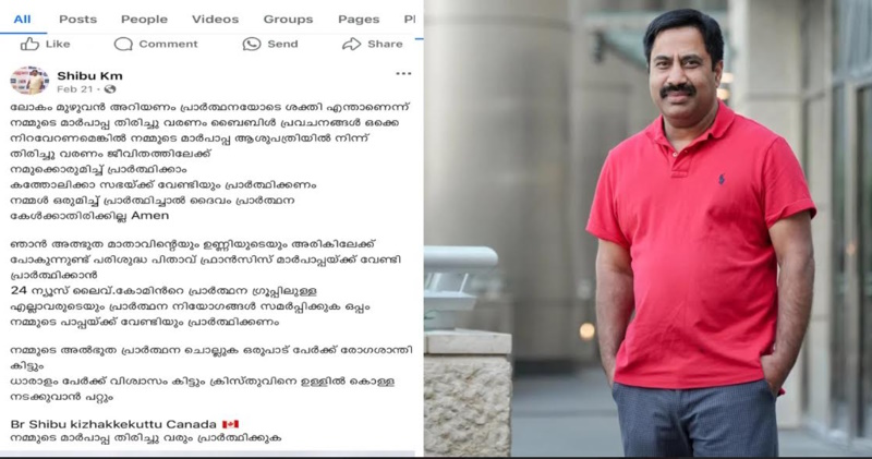 പാപഫ്രാൻസിസ് പാപ്പയുടെ അത്ഭുത രോഗ സൗഖ്യം മുമ്പേ പ്രവചിച്ച് കനേഡിയൻ സുവിശേഷകൻ ബ്രദർ ഷിബു കിഴക്കേക്കുറ്റ്. പാപ്പ ഗുരുതരാവസ്ഥയിൽ ആശുപത്രിയിൽ കഴിഞ്ഞ ഫെബ്രുവരി ഇരുപതിനാണ് പാപ്പയുടെ സൗഖ്യത്തിനായി പ്രാർത്ഥിക്കണമെന്ന് ബ്രദർ തന്റെ പ്രാർത്ഥനഗ്രൂപ്പായ 24ന്യൂസ് ലൈവ്.കോമിൽ പറഞ്ഞത്. അദ്ദേഹത്തിന്റെ അഭ്യർത്ഥന പ്രകാരം നിരവധിപ്പേർ പാപ്പയ്ക്കായി മധ്യസ്ഥ പ്രാർത്ഥന നടത്തുകയും ഉപവാസമെടുക്കുകയും ചെയ്തിരുന്നു. വിശ്വാസപൂർവമുള്ള പ്രാർഥനയ്ക്ക് ശക്തിയുണ്ടെന്ന് തെളിഞ്ഞതായി ബ്രദർ പറഞ്ഞു.