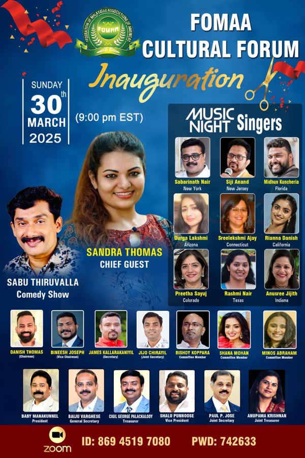 കാലിഫോർണിയ : ഫോമ കൾച്ചറൽ ഫോറം പ്രവർത്തനോദ്ഘാടനം മാർച്ച് 30 ഞായറാഴ്ച ഗംഭീരമായി നടത്തപ്പെട്ടു. വൈകിട്ട് 9:00 ന് സൂമിലൂടെ വിളിച്ചുചേർത്ത ചടങ്ങിൽ, മുഖ്യാതിഥിയായ പ്രശസ്ത സിനിമാ നിർമ്മാതാവും, നടിയുമായ സാന്ദ്ര തോമസ് കൾച്ചറൽ ഫോറത്തിൻറെ ഉദ്ഘാടനം നിർവ്വഹിച്ചു. ഫോമ കൾച്ചറൽ ഫോറത്തിൻറെ പ്രവർത്തനങ്ങൾക്ക് എല്ലാ ഭാവുകങ്ങൾ നേരുകയും കൾച്ചറൽ ഫോറത്തെ നയിക്കാൻ ഏറ്റവും അനുയോജ്യനായ വ്യക്തികളെയാണ് ഫോമാ തെരഞ്ഞെടുത്തിരിക്കുന്നതെന്നും സാന്ദ്ര തോമസ് ഉദ്ഘാടന പ്രസംഗത്തിൽ പറഞ്ഞു. “ഫ്രൈഡേ”, “സക്കറിയയുടെ ഗർഭിണികൾ”, “മങ്കി പെൻ”, “പെരുച്ചാഴി”, “ആട്”, “ഇടക്കാട് ബറ്റാലിയൻ”, “കള്ളൻ ഡിസൂസ”, “നല്ല നിലാവുള്ള രാത്രി”, “ലിറ്റിൽ ഹാർട്സ്” തുടങ്ങി നിരവധി മലയാള സിനിമകളുടെ നിർമ്മാതാവായ സാന്ദ്ര, “ആമേൻ”, “സക്കറിയയുടെ ഗർഭിണികൾ” എന്നീ സിനിമകളിൽ ശ്രദ്ധേയമായ വേഷങ്ങളും ചെയ്തിട്ടുണ്ട്.
