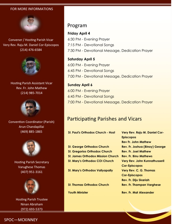 ഏപ്രിൽ 4, 5, 6 വെള്ളി ശനി ഞായർ എന്നീ ദിവസങ്ങളിൽ വൈകിട്ട് 6 30ന് സന്ധ്യാ പ്രാർത്ഥനയ്ക്ക് ശേഷം ഗാനശുശ്രൂഷയും തുടർന്ന് മുഖ്യപ്രഭാഷകൻ വചനശുശ്രൂഷയും നിർവഹിക്കും .ഡാലസിലെ എല്ലാ ഓർത്തഡോക്സ് ദേവാലയങ്ങളും ചേർന്ന് സംയുക്തമായി നടത്തപ്പെടുന്ന ഈ കൺവെൻഷനു ആതിഥേയത്വം മെക്കിനി സെൻറ് പോൾസ് ഇടവകയാണ് . ഈ കൺവെൻഷനിൽ വന്നുചേർന്നു അനുഗ്രഹം പ്രാപിക്കുവാൻ ഏവരെയും ഹാർദവമായി സ്വാഗതം ചെയ്യുന്നതായി സംഘാടകർ അറിയിച്ചു