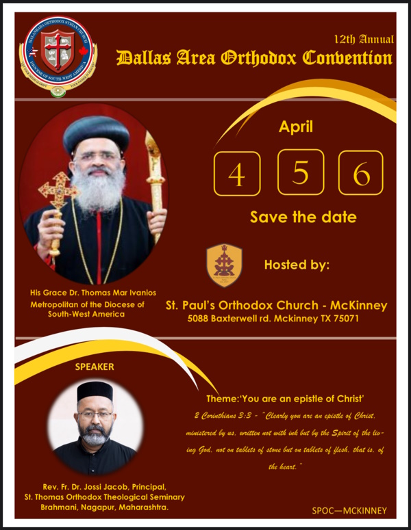 മെക്കിനി(ഡാളസ്): മലങ്കര ഓർത്തഡോക്സ് സഭയിലെ സൗത്ത് വെസ്റ്റ് അമേരിക്കൻ ഭദ്രാസനത്തിലെ ഉൾപ്പെട്ട ഡാലസിലെ വിവിധ ഇടവകകൾ ചേർന്ന് നടത്തിവരുന്ന കൺവെൻഷൻ ഈ വർഷം ഏപ്രിൽ 4 വെള്ളിയാഴ്ച വൈകുന്നേരം 6 30 മുതൽ മെക്കിനി സെൻറ് പോൾസ് ഓർത്തഡോക്സ് പള്ളിയിൽ വച്ച് നടത്തപ്പെടുന്നതാണ് സൗത്ത് വെസ്റ്റ് അമേരിക്കൻ ഭദ്രാസന മെത്രാപ്പോലീത്ത അഭിവന്ദ്യ ഡോക്ടർ തോമസ് മാർ ഇവാനിയോസ് തിരുമേനി ഈ വർഷത്തെ യോഗത്തിൽ അനുഗ്രഹപ്രഭാഷണം നടത്തും . ഓർത്തഡോക്സ് സഭയുടെ നാഗപൂർ സെൻറ് തോമസ് ഓർത്തഡോക്സ് തിയോളജിക്കൽ സെമിനാരി പ്രിൻസിപ്പാളും പ്രശസ്ത വേദശാസ്ത്ര പണ്ഡിതനുമായ ജോസി ജേക്കബ് കൺവെൻഷൻ മുഖ്യപ്രഭാഷകനാണ്