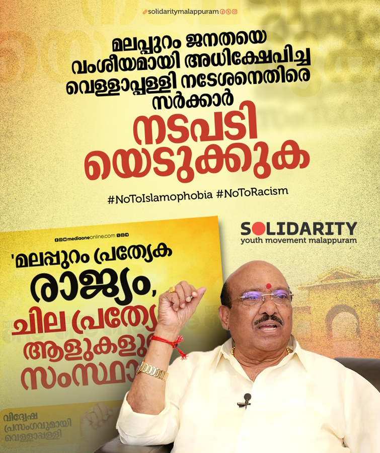 ഈ അവസരത്തിലാണ് നമ്മുടെ വിവേചനങ്ങളുടെ ചരിത്രത്തെ മറന്ന് കൊണ്ട് സവർണ്ണ ഹിന്ദുത്വ രാഷ്ട്രീയ ബോധത്തിന് വഴങ്ങി ഈഴവർ അനുഭവിക്കുന്ന അനീതികൾക്ക് കാരണം മുസ്ലിങ്ങളാണ് എന്ന് പ്രചരിപ്പിക്കും വിധത്തിൽ എസ്.എൻ.ഡി.പി യോഗാദ്ധ്യക്ഷൻ വെള്ളാപ്പള്ളി നടേശൻ മുസ്ലിം വിരുദ്ധ വംശീയ ബോധവും മലപ്പുറം വിരുദ്ധതയും വിളമ്പുന്നത്. ഇവിടെ നൂറ്റാണ്ടുകളായി പിന്നോക്ക വിഭാഗങ്ങളെ പിന്നോക്കമാക്കി നിലനിർത്തുന്ന സവർണ ജാതീയതയെയും അതിൻ്റെ അധികാര ഘടനയേയും അവയെ താലോലിക്കുന്ന ഇടത് വലത് രാഷ്ട്രീയ പാർട്ടികളെയും ഒന്നും ചോദ്യം ചെയ്യാതെ സംഘ്പരിവാർ ഉയർത്തുന്ന അതേ വാദങ്ങളെ ഉന്നയിക്കുക തന്നെയാണ് വെള്ളാപ്പള്ളി ഇവിടെ ചെയ്യുന്നത്. ഇത് അങ്ങേയറ്റം പ്രതിഷേധാർഹവും സമൂഹത്തിൽ സമുദായങ്ങൾക്കിടയിൽ ചിദ്രത ഉണ്ടാക്കുകയും ചെയ്യുന്ന പ്രസ്താവന കൂടിയാണ്.