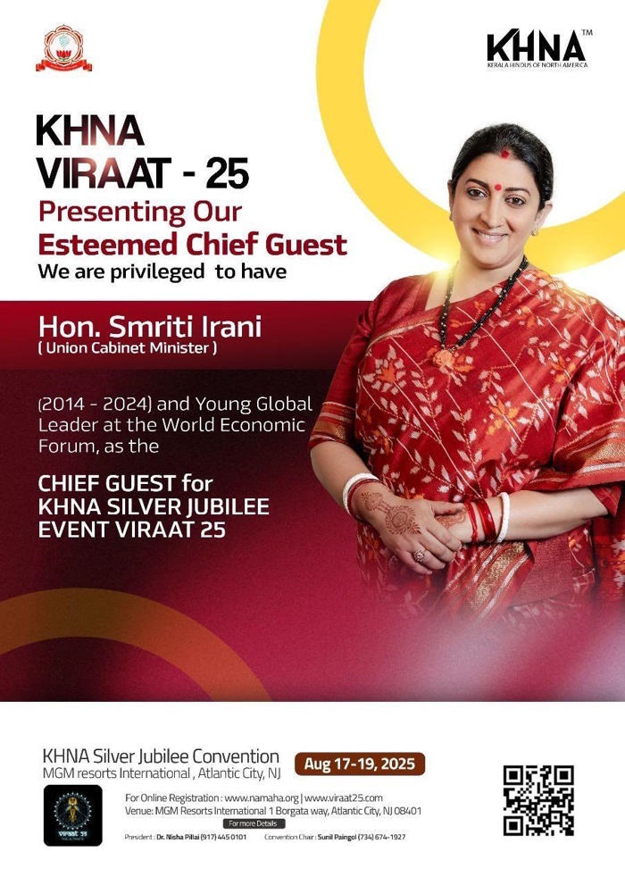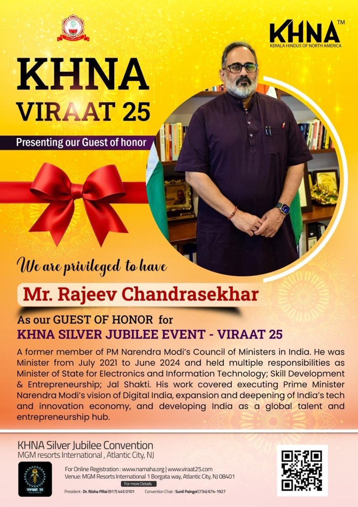 ന്യൂയോര്ക്ക്: ന്യൂജേഴ്സിയിലെ അറ്റ്ലാന്റിക് സിറ്റിയിലുള്ള എം.ജി.എം. ഇന്റർനാഷണലിൽ വെച്ച് ഓഗസ്റ്റ് 17 മുതൽ 19 വരെ നടക്കുന്ന കേരള ഹിന്ദൂസ് ഓഫ് നോർത്ത് അമേരിക്കയുടെ രജത ജൂബിലി കൺവൻഷൻ വളരെ വിപുലമായി സംഘടിപ്പിക്കുവാൻ ഡയറക്ടർ ബോർഡ് അംഗങ്ങളും ട്രസ്റ്റീ ബോർഡ് അംഗങ്ങളും ഒരേ മനസ്സോടെ പ്രവർത്തിച്ചുവരുന്നു. ഈ കണ്വന്ഷന് പൊന്നിൻ ചിങ്ങമാസം 1 മുതൽ 3 വരെയാണ് നടക്കുന്നതെന്ന പ്രത്യേകതയുമുണ്ട്.