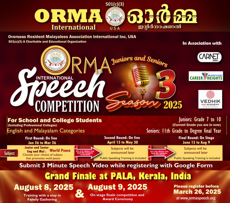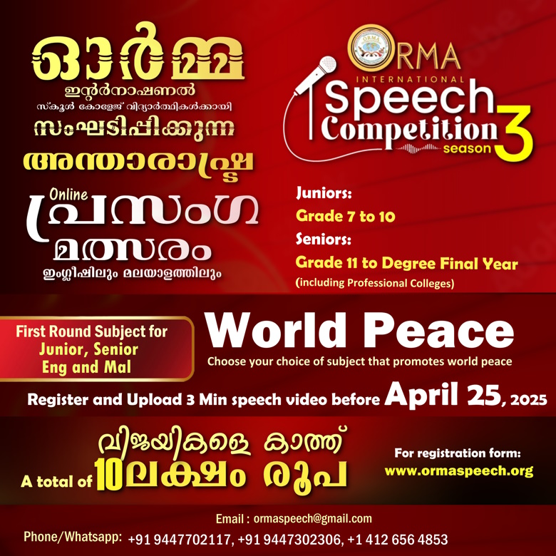 ലോക മലയാളികളെ ഒരു കുടക്കീഴില് അണി നിരത്തുന്ന ഓവർസീസ് റസിഡൻ്റ് മലയാളീസ് അസോസിയേഷന് (ORMA) അഥവാ ‘ഓര്മ്മ ഇൻറർനാഷണൽ വിദ്യാര്ത്ഥികള്ക്കായി ഓണ്ലൈനായി ഒരുക്കുന്ന പ്രസംഗ മത്സരം മൂന്നാം സീസൺ, ആദ്യഘട്ടം ഏപ്രിൽ 25 വരെ. ഒന്നാം സീസണിൽ 428 പേരും, രണ്ടാം സീസണിൽ 1467 പേരും പങ്കെടുത്ത, മൂന്നു ഘട്ടങ്ങളിലായി നടക്കുന്ന മത്സരങ്ങളുടെ വിജയികള്ക്കായി മൂന്നാം സീസണിലും പത്ത് ലക്ഷം രൂപയുടെ ക്യാഷ് അവാര്ഡുകളാണ് കാത്തിരിക്കുന്നത്.