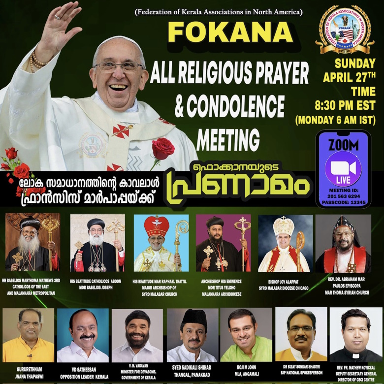 ഏവരും സ്നേഹിച്ചിരുന്ന ഫ്രാൻസിസ് മാർപാപ്പക്ക് ആദരം അർപ്പിക്കാനും ആത്മാവിന്റെ നിത്യശാന്തിക്ക് വേണ്ടി പ്രാർത്ഥിക്കാനും ഏവരും വെർച്യുൽ മീറ്റിങ്ങിൽ പങ്കെടുക്കണം എന്ന് ഫൊക്കാന പ്രസിഡന്റും സജിമോൻ ആന്റണിയും ,എക്സിക്യൂട്ടീവ് കമ്മിറ്റിയും നാഷണൽ കമ്മിറ്റിയും, ട്രസ്റ്റീ ബോർഡും അഭ്യർഥിക്കുന്നു. .