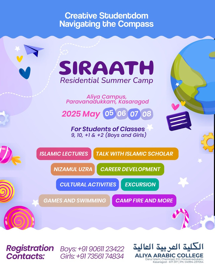 കാസർഗോഡ്: “സർഗാത്മക വിദ്യാർഥിത്വം നന്മയുടെ വഴികാട്ടാൻ” എന്ന പ്രമേയത്തിൽ 9.,10 ,+1 ,+2 ക്ലാസ്സുകളിൽ പഠിക്കുന്ന ആൺകുട്ടികൾക്കും പെൺകുട്ടികൾക്കും വേണ്ടി പരവനടുക്കം ആലിയ അറബിക് കോളേജിൽ മെയ് 5 മുതൽ 8 വരെ “സിറാത്ത്” എന്ന പേരിൽ അവധിക്കാല റെസിഡെൻഷ്യൽ പഠന ക്യാമ്പ് സംഘടിപ്പിക്കുന്നു.