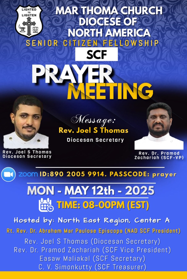 ന്യൂയോർക് :നോർത്ത് അമേരിക്ക മാർത്തോമ്മാ ഭദ്രാസനം സീനിയർ സിറ്റിസൺ ഫെലോഷിപ്പിന്റെ ആഭിമുഖ്യത്തിൽ മെയ് 12നു തിങ്കൾ രാത്രി 8-00 (ഇഎസ്ടി) സൂം പ്ലാറ്റഫോമിൽ പ്രയർ മീറ്റിംഗ് സംഘടിപ്പിക്കുന്നു റവ. ജോയൽ എസ് തോമസ്,ഭദ്രാസന സെക്രട്ടറി മുഖ്യ സന്ദേശം നൽകും