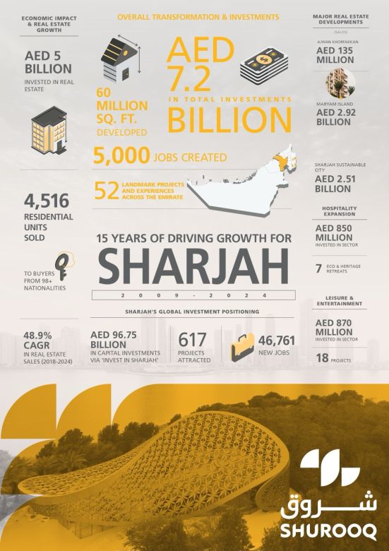 ഷാർജയുടെ വളർച്ചയിൽ നിർണായകമായ നിക്ഷേപങ്ങളുടെയും വികസനത്തിന്റെയും തൊഴിലവസര സൃഷ്ടിയുടെയും കണക്കുകൾ പുറത്ത് വിട്ട് ഷാർജ നിക്ഷേപവികസന അതോറിറ്റി (ഷുറൂഖ്). ഷാർജയുടെ വിവിധഭാഗങ്ങളിലുള്ള 52 പദ്ധതികളിലൂടെ 60 ദശലക്ഷം ചതുരശ്ര അടിയി ഭൂമി വികസിപ്പിക്കുകയും ഇതിനായി 7.2 ബില്യൺ ദിഹർ ചെലവഴിക്കുകയും ചെയ്തു. മൂന്ന് വൻകിട റിയൽ എസ്റ്റേറ്റ് പദ്ധതികൾ, 18 വിനോദകേന്ദ്രങ്ങൾ, 10 ഹോസ്പിറ്റാലിറ്റി പദ്ധതികൾ, 7.7 കിലോമീറ്റർ ബീച്ച് വികസനം എന്നിവ ഇതുവരെയായി പൂർത്തിയാക്കി. നേരിട്ടും അല്ലാതെയുമായി സ്വദേശികളും വിദേശികളുമടക്കം 5,000 പേർക്ക് തൊഴിൽ നൽകി. സ്ഥാപിതമായി 15 വർഷം പൂർത്തീകരിക്കുന്ന വേളയിലാണ് ഷുറൂഖിന്റെ നേതൃത്വത്തിൽ നടത്തിയ പ്രവർത്തനങ്ങളുടെ വിശദറിപ്പോർട്ട് പ്രസിദ്ധീകരിച്ചത്.