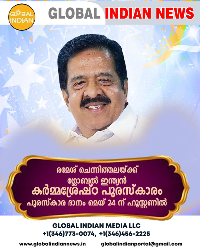 ഹൂസ്റ്റൺ: രാഷ്ട്രീയത്തിൽ മാത്രമല്ല, സാമൂഹ്യ സേവന രംഗത്തും തന്റേതായ വ്യക്തിമുദ്ര പതിപ്പിച്ച കേരളത്തിലെ ജനകീയ നേതാവ് രമേശ് ചെന്നിത്തലയ്ക്ക് ഗ്ലോബൽ ഇന്ത്യൻ ന്യൂസിന്റെ പ്രഥമ “കർമ്മ ശ്രേഷ്ഠ അവാർഡ്” ഒരു ലക്ഷം രൂപയും പ്രശസ്തി പത്രവും ഫലകവും അടങ്ങുന്ന പുരസ്കാരം ഏറ്റുവാങ്ങുന്നത്തിനായി രമേശ് ചെന്നിത്തല അമേരിക്കയിൽ എത്തിച്ചേരും.
