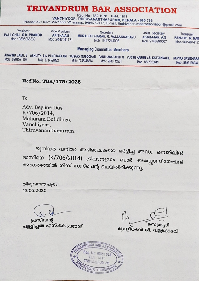 ഒളിവില് പോയ ബെയ്ലിൻ ദാസിനെ ബാർ അസോസിയേഷൻ സസ്പെൻഡ് ചെയ്തു. വഞ്ചിയൂരിലെ ത്രിവേണി ആശുപത്രി റോഡിലുള്ള മഹാറാണി ബിൽഡിംഗിലെ ബെയ്ലിൻ ദാസിന്റെ ഓഫീസിൽ ചൊവ്വാഴ്ച ഉച്ചയോടെയാണ് സംഭവം നടന്നത്. സഹപ്രവർത്തകയ്ക്ക് നേരെയുണ്ടായ മനുഷ്യത്വരഹിതമായ ആക്രമണം കണ്ടിട്ടും, അതേ ഓഫീസിലെ സഹപ്രവര്ത്തകര് ആരും തന്നെ ഇടപെടാൻ ധൈര്യം കാണിച്ചില്ലെന്നു പറയുന്നു.