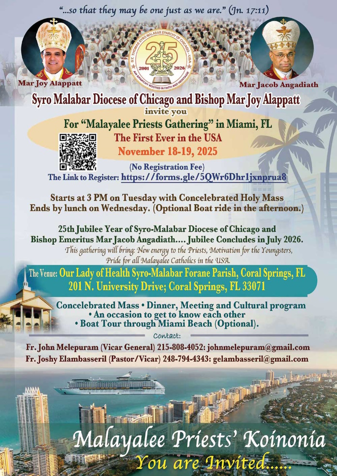 മയാമി: മയാമി നഗരാതിര്‍ത്തിയില്‍ മലയാളികള്‍ക്കായി തലയെടുപ്പോടുകൂടി ഉയര്‍ന്നു നില്‍ക്കുന്ന ഔവര്‍ ലേഡി ഓഫ് ഹെല്‍ത്ത് കാത്തലിക് ഫോറോനാ ദേവാലയത്തിന്റെ ആഭിമുഖ്യത്തില്‍; ചിക്കാഗോ സീറോ മലബാര്‍ രൂപതയുടെ രജതജൂബിലി ആഘോഷങ്ങളുടെ ഭാഗമായിട്ടാണ് ഈ അത്യാപൂര്‍വ്വമായ വൈദിക സംഗമം 2025 നവംബര്‍ 18, 19 തീയതികളില്‍ സംഘടിപ്പിക്കുന്നത്.