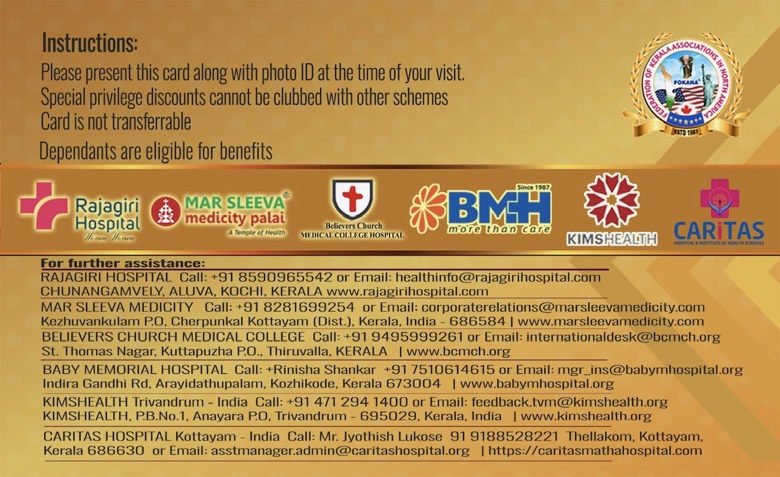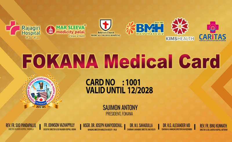 ഫൊക്കാനയിലെ അംഗസംഘടനയിലെ എല്ലാ അംഗങ്ങൾക്കും അവരുടെ കുടുംബാംഗങ്ങൾക്കും നാട്ടിലെ ബന്ധു മിത്രാധികൾക്കും പ്രയോജനകരമായ ഒട്ടേറെ ഇളവുകൾ ഉൾക്കൊള്ളിച്ചിട്ടുകൊണ്ട് പുതിയ ഹെൽത്ത് കാർഡു നിലവിൽവന്നുരിക്കുന്നത്. ഹെൽത്ത് കാർഡ് ഹോൾഡേഴ്സിന് സ്പെഷ്യൽ ഡിസ്കൗണ്ട്കളും സ്പെഷ്യൽ പ്രിവിലേജുകളും ഈ ഹോസ്പിറ്റലുകളിൽഏർപ്പെടുത്തിയിട്ടുണ്ട്.
