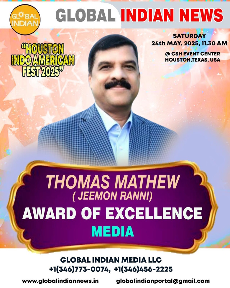ഹൂസ്റ്റൺ: ഹൂസ്റ്റൺ: മെയ് 24 നു ശനിയാഴ്ച ഹൂസ്റ്റണിൽ ദൃശ്യ സംഗീത വിസ്മയം തീർത്ത ഇൻഡോ അമേരിക്കൻ ഫെസ്റ്റിന്റെ പുരസ്കാര രാവിൽ അമേരിക്കയിലെ മാധ്യമ രംഗത്തെ സജീവ സാന്നിധ്യമായ ജീമോൻ റാന്നി (തോമസ് മാത്യു) യ്ക്ക് പത്രപ്രവർത്തന രംഗത്തെ സമാനതകളില്ലാത്ത സംഭാവനകൾക്ക് “മീഡിയ എക്സലൻസ് പുരസ്കാരം” നൽകി ആദരിച്ചു.
