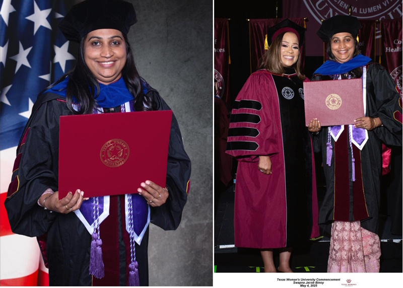 ടെക്സസ് വിമൻസ് യൂണിവേഴ്സിറ്റിയുടെ ഹൂസ്റ്റൺ ക്യാമ്പസ് പ്രസിഡന്റ് ഡോ. മോണിക്ക ജി വില്യംസിൽ നിന്നുമാണ് ഡോ. സ്വപ്ന ജേക്കബ് ബിനോയി തന്റെ പി എച്ച് ഡി ഏറ്റുവാങ്ങിയത്.