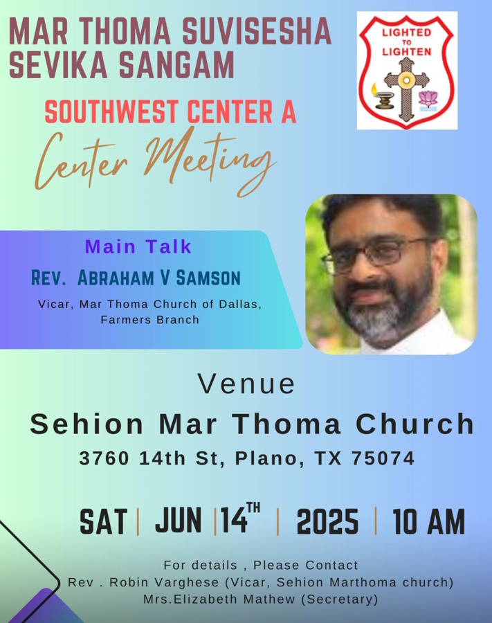 ജൂൺ 14 ശനിയാഴ്ച രാവിലെ 10 മുതൽ പ്ലാനോ സെഹിയോൻ മാർത്തോമ ചർച്ചിൽ ആരംഭിക്കുന്ന യോഗത്തിൽ മാർത്തോമാ ചർച്ച് ഓഫ് ഡാലസ് ഫാർമേഴ്സ് ബ്രാഞ്ച് വികാരി റവ:എബ്രഹാം വി സാംസൺ മുഖ്യപ്രഭാഷകൻ ആയിരിക്കും. സൗത്ത് വെസ്റ്റ് സെൻററിലെ എല്ലാ ഇടവകകളിൽ നിന്നുള്ള സുവിശേഷ സേവികാ അംഗങ്ങൾ  ഈ മീറ്റിംഗ് വന്ന് പങ്കെടുക്കണമെന്ന് സംഘാടകർ അഭ്യർത്ഥിക്കുന്നു