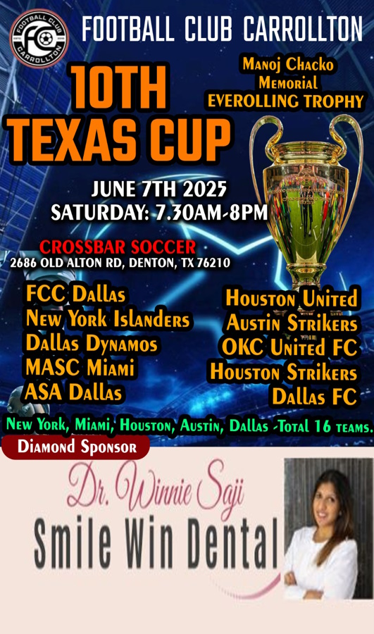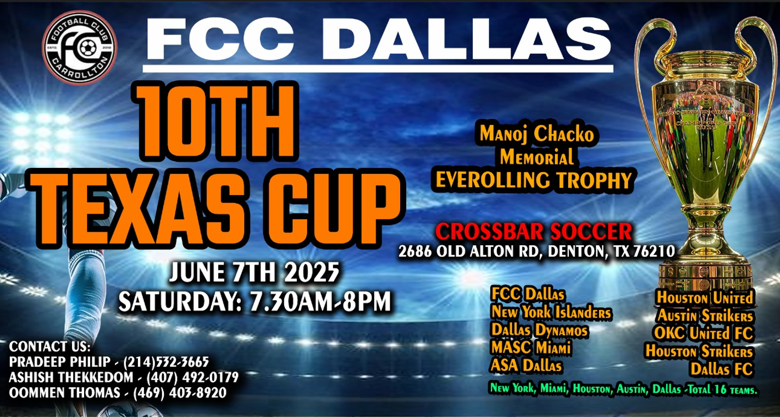 ഡാളസ്: ഡാളസിലെ മലയാളി സോക്കർ ക്ലബായ ഫുട്ബോൾ ക്ലബ് ഓഫ് കരോൾട്ടൺ (എഫ്‌സിസി ഡാളസ്) സംഘടിപ്പിക്കുന്ന പത്താമത് ടെക്‌സാസ് കപ്പ് (മനോജ് ചാക്കോ മെമ്മോറിയൽ എവർ റോളിംഗ് ട്രോഫി) സോക്കർ ടൂർണമെന്റ് ജൂൺ 7  ശനിയാഴ്ച നടക്കും.