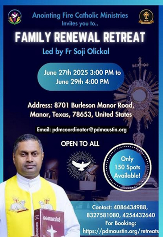 ആത്മീയ നവീകരണവും, ദൈവാനുഗ്രഹവും പ്രാപിക്കാന് നിങ്ങളുടെ കുടുംബങ്ങള്ക്കൊപ്പം ഈ ധ്യാനത്തില് പങ്കെടുത്ത് ഒരു അവിസ്മരണീയ ആത്മീയ യാത്രയിലേക്ക് എല്ലാവര്ക്കും സ്വാഗതം.