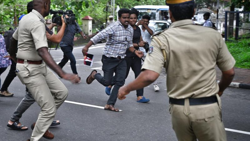 ഗവർണർ രാജേന്ദ്ര വിശ്വനാഥ് അർലേക്കറിനെതിരെ മുദ്രാവാക്യം വിളിച്ച ഇടതുപക്ഷ വിദ്യാർത്ഥി പ്രവർത്തകർ മഹാത്മാഗാന്ധിയുടെയും ബി.ആർ. അംബേദ്കറുടെയും ഫോട്ടോകൾ കൈകളിൽ പിടിച്ച് രാജ്ഭവൻ കോമ്പൗണ്ട് ചുവരുകളിൽ ഒട്ടിക്കാൻ നിർബന്ധിച്ചു.