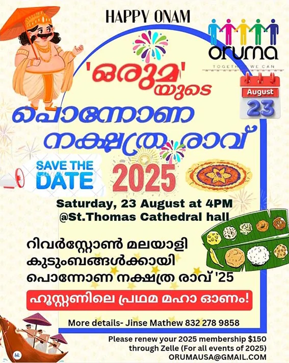 ഹൂസ്റ്റണ്: ഗ്രേറ്റര് ഹൂസ്റ്റണിലെ ഏറ്റവും ശക്തമായ റെസിഡന്ഷ്യല് കമ്യൂണിറ്റി ഓര്ഗനൈസേഷനായ ഔവ്വര് റിവര്സ്റ്റോണ് യുണ്ണെറ്റഡ് മലയാളി അസോസിയേഷന് (ഒരുമ) ലോക മലയാളികളുടെ ഒരുമയുടെ ദേശീയ ഉല്സവമായ തിരുവോണത്തെ വരവേല്ക്കുവാന് തയ്യാറാകുന്നു. കഴിഞ്ഞ ഒന്നര പതിറ്റാണ്ടായി മുടങ്ങാതെ കൊണ്ടാടുന്ന ഒരുമയുടെ ഓണാഘോഷം ഗ്രേറ്റര് ഹൂസ്റ്റണലെ എല്ലാ വര്ഷവും മാവേലി തമ്പുരാനെ ഹൂസ്റ്റണിലേക്ക് വരവേറ്റു കൊണ്ടുള്ള പ്രഥമ ഓണാഘോഷമാണ്.