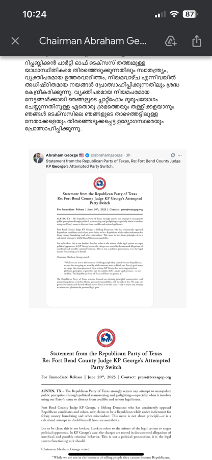 പൊതുജനങ്ങളുടെ ധാരണയെ രാഷ്ട്രീയ തന്ത്രങ്ങളിലൂടെ ദുരുപയോഗം ചെയ്യുന്നതിനുള്ള ഏതൊരു ശ്രമത്തെയും റിപ്പബ്ലിക്കൻ പാർട്ടി ഓഫ് ടെക്സസ് ശക്തമായി തള്ളിക്കളയുന്നു – പ്രത്യേകിച്ചും ഇത് നമ്മുടെ പാർട്ടിയുടെ പേര് വിശ്വസനീയവും ഗൗരവതരവുമായ നിയമപ്രശ്നങ്ങളിൽ നിന്ന് ശ്രദ്ധ മാറ്റാൻ ഉപയോഗിക്കുമ്പോൾ. ഫോർട്ട് ബെൻഡ് കൗണ്ടി ജഡ്ജ് കെ.പി. ജോർജ്, റിപ്പബ്ലിക്കൻ സ്ഥാനാർത്ഥികളെയും മൂല്യങ്ങളെയും സ്ഥിരമായി എതിർത്തിരുന്ന ഒരു ആജീവനാന്തം ഡെമോക്രാറ്റാണ്, ഇപ്പോൾ ഗുരുതരമായ പണമിടപാടുകളും മറ്റ് ദുരുപയോഗങ്ങളും ഉൾപ്പെടെയുള്ള കുറ്റാരോപണങ്ങൾ നേരിടുമ്പോൾ താൻ ഒരു റിപ്പബ്ലിക്കൻ ആണെന്ന് അവകാശപ്പെടുന്നു. ഇത് തത്ത്വങ്ങളുടെ പേരിലല്ല – ഇത് സ്വയം ഉത്തരവാദിത്തത്തിൽ നിന്ന് രക്ഷപ്പെടാനുള്ള ഒരു തന്ത്രമാണ്. അദ്ദേഹത്തിന് ഒരിക്കലും ഒരു റിപ്പബ്ലിക്കൻ ആകാൻ കഴിയില്ല. ഒരു കാര്യം വ്യക്തമാക്കാം: ഇത് നിയമയുദ്ധമല്ല. രാഷ്ട്രീയ എതിരാളികളെ ലക്ഷ്യമിടാൻ തൻ്റെ സ്ഥാനം ഉപയോഗിച്ച ആരോപണമാണ്. കെ.പി. ജോർജിന്റെ കാര്യത്തിൽ, ആരോപണങ്ങൾ ധാർമ്മികവും നിയമവിരുദ്ധവുമായ പെരുമാറ്റത്തെക്കുറിച്ചുള്ള രേഖപ്പെടുത്തിയ ആരോപണങ്ങളിൽ അധിഷ്ഠിതമാണ്. അയാൾ ഒന്നിലധികം തവണ അറസ്റ്റിലായി.ഇത് രാഷ്ട്രീയ പ്രോസിക്യൂഷൻ അല്ല, നിയമവ്യവസ്ഥ അതിന്റെ ധർമ്മം നിർവ്വഹിക്കുന്നതാണ്.