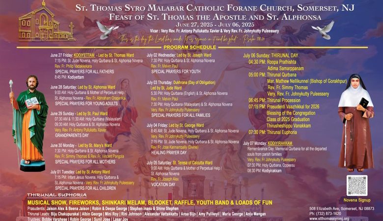 ന്യൂജേഴ്സി: സോമര്സെറ്റ് സെൻറ് തോമസ് സീറോ മലബാര് കാത്തലിക് ഫൊറോനാ ദേവാലത്തില് ഭാരതത്തിന്റെ അപ്പസ്തോലനും ഇടവക മധ്യസ്ഥനുമായ വിശുദ്ധ തോമാശ്ശീഹായുടേയും ഭാരതത്തിലെ ആദ്യ വിശുദ്ധ അല്ഫോന്സാമ്മയുടേയും തിരുനാള് 27-മുതല് ജൂലൈ 6-വരെ സംയുക്തമായി കൊണ്ടാടുമെന്ന് ഇടവക വികാരി ഫാ. ആന്റണി പുല്ലുകാട്ട് സേവ്യര്, ഇടവകയുടെ പുതിയ വികാരിയായി ചുമതലയെടുക്കുന്ന ഫാ. ജോണിക്കുട്ടി പുലിശ്ശേരി എന്നിവരുടെ സംയുക്ത പ്രതാവനയിലൂടെ അറിയിച്ചു.