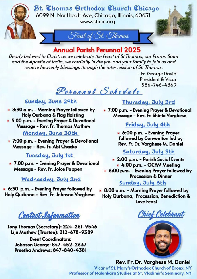 ഷിക്കാഗോ സെന്റ് തോമസ് ഓർത്തോഡോക്സ് ഇടവകയുടെ കാവൽപിതാവും ഇന്ത്യയുടെ അപ്പോസ്തോലനുമായ പരിശുദ്ധ മാർത്തോമാ ശ്ലീഹായുടെ ദുഖറോനോയും ഇടവക പെരുന്നാളും ജൂലൈ 4,5,6 (വെള്ളി, ശനി, ഞായർ) തീയതികളിൽ ഭക്തിയാദരപൂർവ്വം കൊണ്ടാടുന്നു.