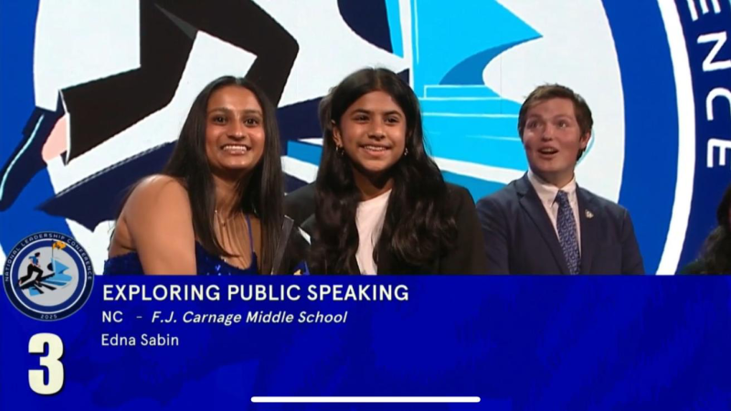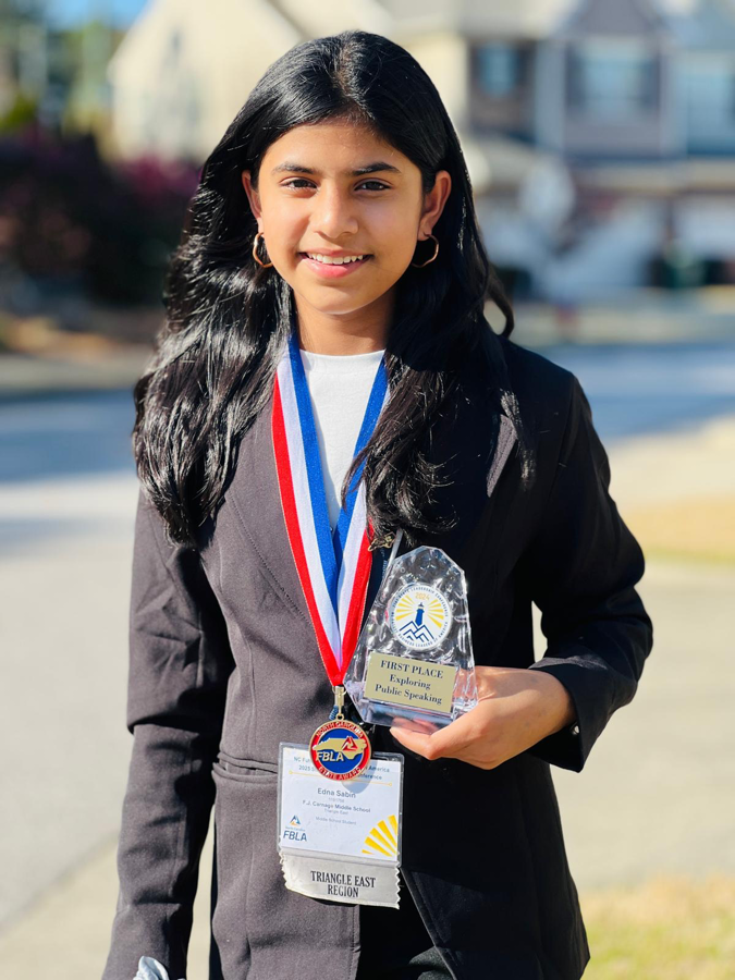 റാലി, നോർത്ത് കരോലിന: ഫ്യൂച്ചർ ബിസിനസ് ലീഡേഴ്സ് ഓഫ് അമേരിക്ക (FBLA) ദേശീയതലത്തിൽ നടത്തിയ പ്രസംഗ മത്സരത്തിൽ മലയാളി വിദ്യാർത്ഥിനിയായ എഡ്ന എലിസ സാബിൻ മൂന്നാം സ്ഥാനം കരസ്ഥമാക്കി.