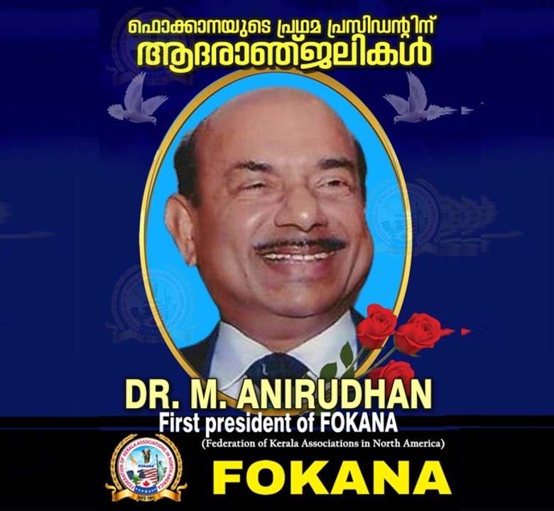 ന്യൂയോർക്ക് : ഫൊക്കാനയുടെ രൂപീകരണത്തിന് നേതൃത്വം നൽകിയ വ്യക്തികളിൽ പ്രമുഖനും ഫൊക്കാനയുടെ പ്രഥമ പ്രസിഡൻ്റും ആയിരുന്ന ഡോ. എം അനിരുദ്ധന് ഫൊക്കാനയുടെ കണ്ണീർ പ്രണാമം. മൂന്ന് തവണ ഫൊക്കാന പ്രസിഡൻ്റ് ആയി സേവനമനുഷ്ടിച്ച ഡോ. അനിരുദ്ധൻ ഫൊക്കാനയുടെ എക്കാലത്തേയും മികച്ച പ്രസിഡൻ്റാണ് . ഫൊക്കാനയെ അമേരിക്കൻ മലയാളികളുടെ പ്രിയപ്പെട്ട സംഘടനയാക്കുന്നതിലും, ജനകിയമാക്കുന്നതിലും ശ്രീ അനിരുദ്ധൻ വഹിച്ച പങ്ക് വളരെ വലുതാണ്. 1983 ൽ ആദ്യ പ്രസിഡന്റ് ആയ ഡോ. എം അനിരുദ്ധൻ അന്നുമുതൽ മുതൽ 2024 സജിമോൻ ആന്റണി പ്രസിഡന്റ് ആയി നേതൃത്വം ഏൽക്കുബോഴും ഫൊക്കാനയുടെ തലതൊട്ടപ്പനായി നിലകൊണ്ട അദ്ദേഹത്തിന്റെ നേതൃത്വപാടവം ഫൊക്കാനക്ക് എന്നും ഒരു മുതൽക്കൂട്ട് ആയിരുന്നു .