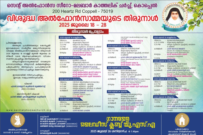 ജൂലൈ 26 ശനി: വൈകുന്നേരം 4:30 നു മുതൽ ദിവ്യകാരുണ്യആരാധന. വൈകുന്നേരം 5:30 നു വി. കുർബാന, നൊവേന, ലദീഞ്ഞ് (റവ. ഫാ. സിബി സെബാസ്റ്റ്യൻ MST). തുടർന്ന് 7:00 മണിക്ക് സെന്റ് അൽഫോൻസാ ഓഡിറ്റോറിയത്തിൽ മെലഡീസ് ക്ലബ് യുഎസ്എ ഒരുക്കുന്ന ഗാനമേളയും, വാർഡ് യുണിറ്റുകൾ സംഘടിപ്പിക്കുന്ന ‘തട്ടുകട’ ഭക്ഷ്യ മേളയും.