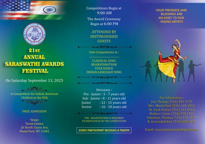 ന്യൂയോര്ക്ക്: അമേരിക്കയില് വളരുന്ന ഇന്ത്യന് വംശജരിലെ കുട്ടികളിലെ സംഗീതവും, നൃത്തവും പ്രോത്സാഹിപ്പിക്കുന്ന സരസ്വതി അവാര്ഡ്സിന്റെ 21-ാം സരസ്വതി അവാര്ഡിനുള്ള മത്സരങ്ങള് സെപ്തംബര് 13ന് ശനിയാഴ്ച ന്യൂയോര്ക്കിലെ ഫ്ളോറല് പാര്ക്കിലുള്ള ടൈസണ് സെന്ററില് – TYSON CENTER, 26 NORTH TYSON AVE, NY 11001 ല് വച്ച് നടത്തുന്നു. അമേരിക്കയില് വളരുന്ന ഇന്ത്യന് വംശജരുടെ 5 വയസ്സു മുതല് 18 വയസ്സുവരെ പ്രായമുള്ള കുട്ടികള്ക്ക് ഈ മത്സരത്തില് പങ്കെടുക്കാവുന്നതാണ്.