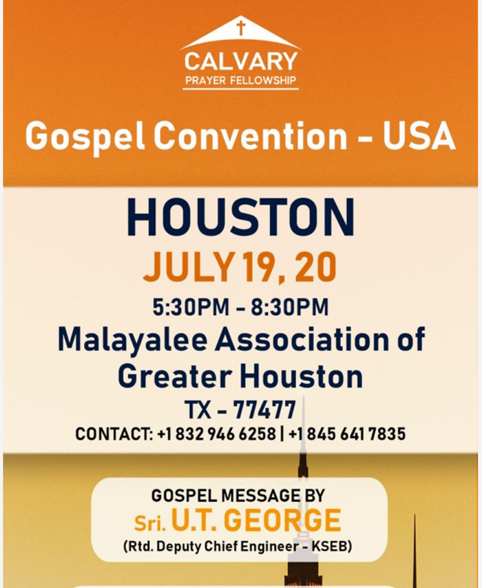 ഹൂസ്റ്റൺ :കാൽവരി പ്രയർ ഫെല്ലോഷിപ്പ് ഹൂസ്റ്റണിൽ ജൂലൈ 19 ,20 തീയതികളിൽ വൈകീട്ട് 5 ;30 സംഘടിപ്പിക്കുന്ന ഗോസ്പൽ കൺവെൻഷനിൽ പ്രശസ്ത സുവിശേഷ പ്രസംഗീകൻ യു റ്റി ജോർജ് (റിട്ടയേർഡ് ചീഫ് എഞ്ചിനീയർ കേരള വൈദുത ബോർഡ്) വചന പ്രഘോഷണം നിർവ്വഹിക്കുന്നു. മലയാളി അസോസിയേഷൻ ഓഫ് ഗ്രേറ്റർ ഹൂസ്റ്റൺ ഓഡിറ്റോറിയത്തിലാണ് സുവിശേഷ പ്രഘോഷണം സംഘടിപ്പിച്ചിരിക്കുന്നത് .എല്ലാവരെയും ക്ഷണിക്കുന്നതായി സംഘാടകർ അറിയിച്ചു.