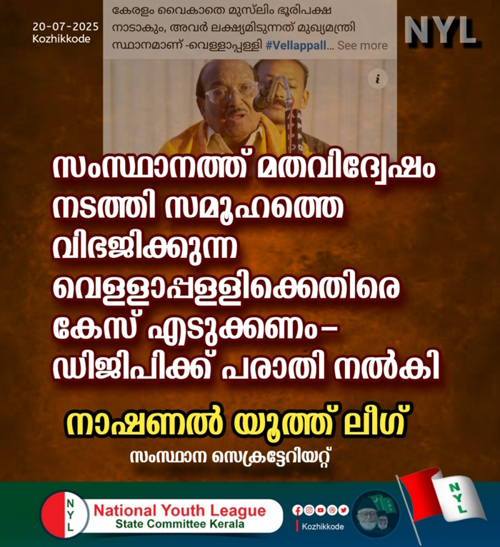 കോഴിക്കോട്: നിരന്തരമായി സാമുദായിക സൗഹാർദ്ദത്തെ വെല്ലുവിളിച്ചുകൊണ്ട്, കള്ളങ്ങൾ പ്രചരിപ്പിച്ച് മുസ്ലിം ജനവിഭാഗത്തെ അപരവത്കരിക്കുന്ന എസ് എൻ ഡി പി നേതാവ് വെള്ളാപ്പള്ളി നടേശൻ നടത്തുന്ന വിദ്വേഷ പരാമർശങ്ങൾ സംഘപരിവാർന്റെ ധ്രുവീകരണ രാഷ്ട്രീയത്തിന് ഇന്ധനമാണെന്നും, സംസ്ഥാനത്തെ മതനിരപേക്ഷ കക്ഷികൾ ഇക്കാര്യത്തിൽ മൗനം വെടിഞ്ഞ് രംഗത്ത് വരണമെന്നും ശക്തമായ നിയമനടപടി സ്വീകരിക്കണമെന്നും നാഷണൽ യൂത്ത് ലീഗ് സംസ്ഥാന സെക്രട്ടേറിയറ്റ് ആവശ്യപ്പെട്ടു.