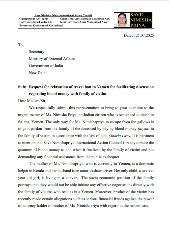 സാമൂഹിക-സാമ്പത്തിക പരിമിതികൾ കാരണം നിമിഷ പ്രിയയുടെ കുടുംബത്തിന് ഇരയുടെ കുടുംബവുമായി ഫലപ്രദമായ ചർച്ചകൾ നടത്താൻ കഴിയില്ലെന്ന് കൗൺസിൽ വിദേശകാര്യ മന്ത്രാലയത്തിന് നൽകിയ മെമ്മോറാണ്ടത്തിൽ പറഞ്ഞു. യെമനിൽ നിമിഷ പ്രിയയുടെ അമ്മയെ പ്രതിനിധീകരിക്കുന്ന പവർ ഓഫ് അറ്റോർണി ഉടമയ്‌ക്കെതിരെ ഇരയുടെ സഹോദരൻ അടുത്തിടെ ഉന്നയിച്ച സാമ്പത്തിക തട്ടിപ്പ് ആരോപണങ്ങളും കൗൺസിൽ ചൂണ്ടിക്കാട്ടി.