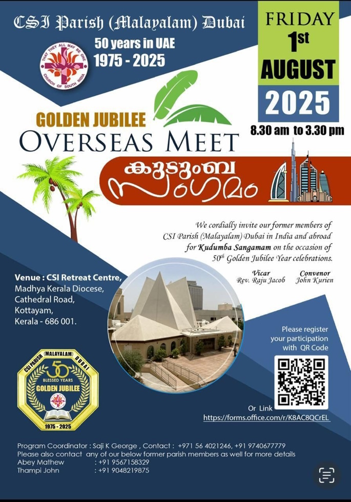 കഴിഞ്ഞ ഒക്ടോബർ 5ന് ആണ് സിഎസ്ഐ ദുബായ് മലയാളം ഇടവകയുടെ ഒരു വർഷം നീണ്ടുനിൽക്കുന്ന സുവർണ ജൂബിലി ആഘോഷങ്ങൾക്ക് തുടക്കമായത്.ദുബായ് ജെംസ് സ്കൂൾ ഓഡിറ്റോറിയത്തിൽ നടന്ന ചടങ്ങ് മദ്ധ്യ കേരള മഹാ ഇടവക ബിഷപ്പ് റൈറ്റ് റവ മലയിൽ സാബു കോശി ചെറിയാൻ ആണ് ഉദ്ഘാടനം ചെയ്തത്. ഇടവക വികാരി രാജു ജേക്കബ് അധ്യക്ഷത വഹിച്ചു.ദുബായ് ഇന്ത്യൻ കോൺസൽ ജനറൽ സതീഷ് കുമാർ ശിവൻ മുഖ്യാതിഥിയായിരുന്നു. ഇടവക സ്ഥാപക അംഗം മാത്യൂ വർഗ്ഗീസ് ഇടവക ചരിത്രം പങ്കു വെച്ചു.വിവിധ ക്ഷേമ പ്രവർത്തനങ്ങളുടെ ഉദ്ഘാടനവും നടന്നു.