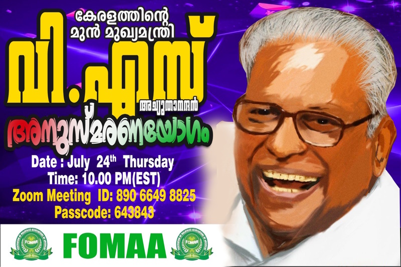 ന്യൂയോർക്ക്: കഴിഞ്ഞ ദിവസം വിടപറഞ്ഞ, വിപ്ലവ സൂര്യൻ, മുതിർന്ന കമ്മ്യൂണിസ്റ് നേതാവും, കേരളത്തിൻറെ മുൻ മുഖ്യമന്ത്രിയുമായ സഖാവ് വി. എസ്. അച്യുതാനന്ദനോടു അമേരിക്കൻ മലയാളികൾക്കുള്ള ആദരവ് പ്രകടിപ്പിക്കുന്നതിനുവേണ്ടി, ഫെഡറേഷൻ ഓഫ് മലയാളി അസോസിയേഷൻസ് ഓഫ് അമേരിക്കാസ് (ഫോമാ) അനുസ്മരണ യോഗം സംഘടിപ്പിക്കുന്നു. ജൂലൈ 24-)0 തീയതി വ്യാഴാഴ്ച രാത്രി 10 മണിക്ക് (EST) സൂമിലൂടെ നടത്തുന്ന ഈ യോഗത്തിലേക്ക് എല്ലാ മലയാളികളേയും സ്വാഗതം ചെയ്യുന്നു. ഫോമ പ്രസിഡൻറ് ബേബി മണക്കുന്നേൽ അധ്യക്ഷത വഹിക്കുന്ന യോഗത്തിൽ കേരളത്തിൽ നിന്നും മന്ത്രിമാരും, എം.എൽ.എ മ്മാരും ഉൾപ്പെടെ വിവിധ രാഷ്ട്രീയ നേതാക്കളും പങ്കെടുക്കുന്നതാണ്.