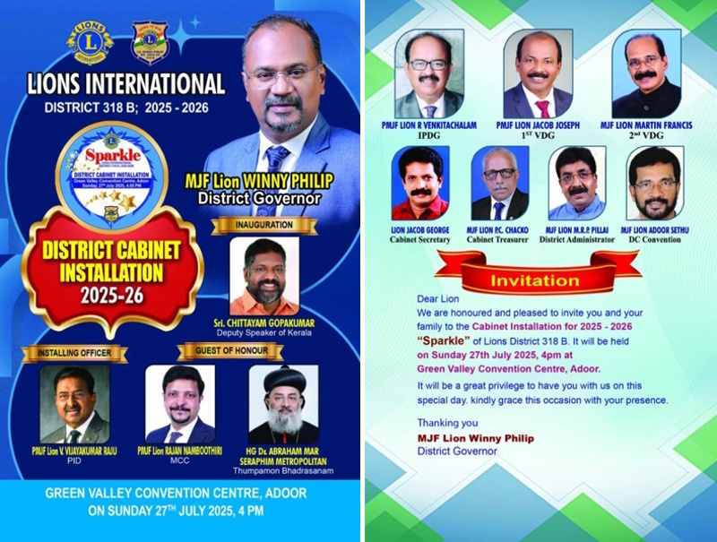 എടത്വ ടൗൺ: ലയൺസ് ക്ലബ് ഡിസ്ട്രിക്ട് 318ബി ഭാരവാഹികളുടെ സ്ഥാനാരോഹണം ജൂലൈ 27 ഞായറാഴ്ച 4:00 മണിക്ക് അടൂരിൽ ഗ്രീൻ വാലി കൺവൻഷൻ സെന്ററിൽ നടക്കും.