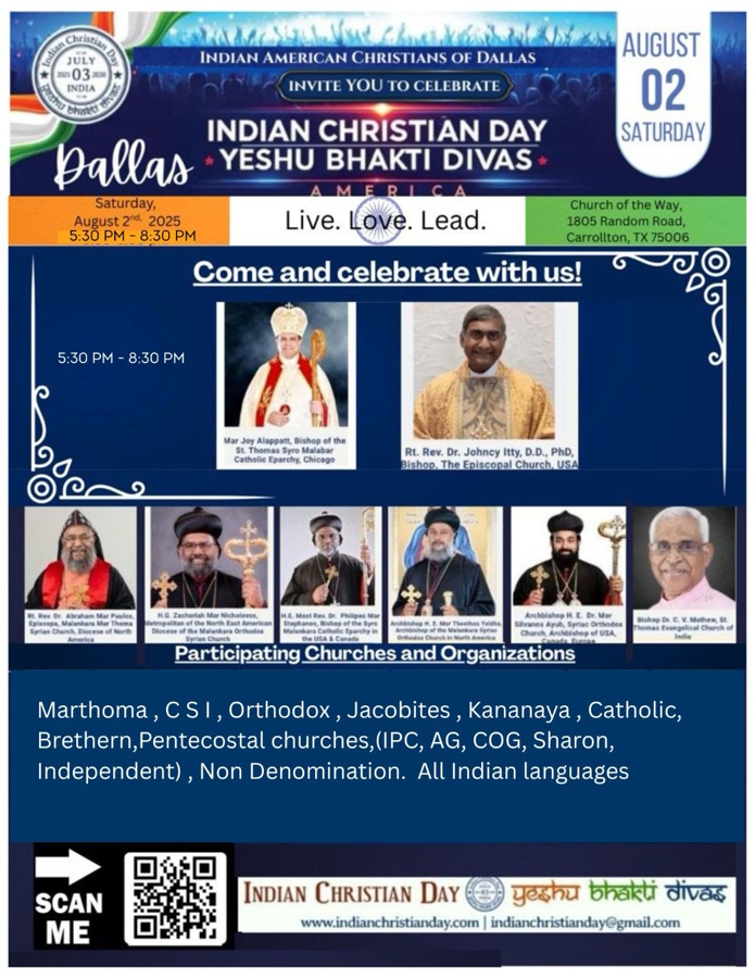ഡാളസ് : അമേരിക്കയിലെ വിവിധ സംസ്ഥാനങ്ങളിൽ നിന്നുള്ള ക്രൈസ്തവ സഭകളും ക്രിസ്തീയ സംഘടനകളും സംയുക്തമായി കരോൾട്ടൺ സിറ്റിയിൽ ആഗസ്റ്റ് 2 ന് വൈകിട്ട് 5.30 ന് ക്രിസ്റ്റ്യൻ ഡേ ആഘോഷിക്കുന്നു. മാർത്തോമ, സി. എസ്.ഐ, ഓർത്തോഡക്സ്, യാക്കോബയ്റ്റ്സ്, കാനാനായ, കാത്തലിക്, ബ്രദറൺ, പെന്തക്കോസ്ത്, (ഐ.പി.സി, അസംബ്ലീസ് ഓഫ് ഗോഡ്, ചർച്ച ഓഫ് ഗോഡ്, ശാരോൻ, സ്വതന്ത്ര സഭകൾ) തുടങ്ങിയ സഭകളിൽ നിന്നുള്ള സഭാ നേതാക്കളും സഭാ വിശ്വാസികളും ഈ സമ്മേളനത്തിൽ പങ്കെടുക്കുന്നതാണ്.