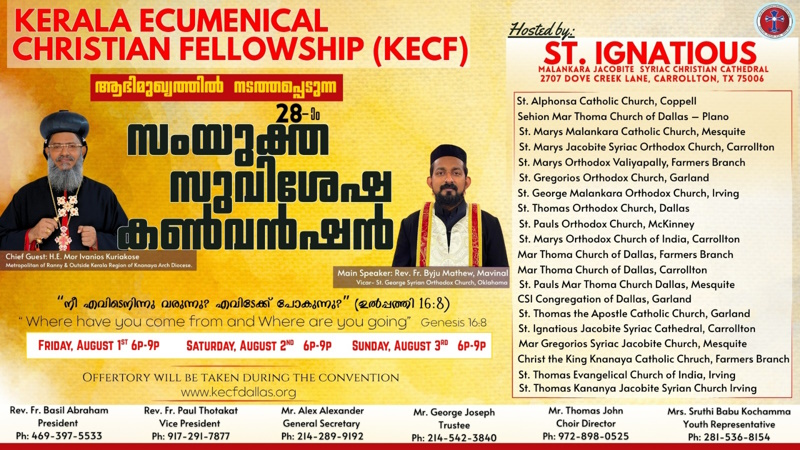 ഡാളസ്: കേരള എക്യുമെനിക്കൽ ക്രിസ്ത്യൻ ഫെലോഷിപ്പ് (കെഇസിഎഫ്) വാർഷിക കൺവെൻഷൻ 2025 ഓഗസ്റ്റ് 1, 2, 3 തീയതികളിൽ നടക്കുമെന്നു ഫെലോഷിപ്പ് സെക്രട്ടറി അലക്സ് അലക്സാണ്ടർ അറിയിച്ചു.