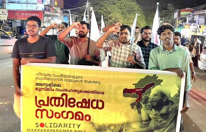 കൂട്ടിലങ്ങാടി : അസമിൽ ആയിരക്കണക്കിന് സാധാരണക്കാരുടെ വീടുകൾ ബുൾഡോസർ വെച്ച് ഇടിച്ചു നിരപ്പാക്കുന്നതിനെതിരെ പ്രതിഷേധിച്ച വ്യക്തിയെ വെടിവെച്ചു കൊന്ന പോലീസ് നടപടി അങ്ങേയറ്റം പ്രതിഷേധാർഹമാണെന്ന് സോളിഡാരിറ്റി യൂത്ത്മൂവ്മെന്റ് മലപ്പുറം ജില്ല പ്രസിഡന്റ് സാബിക് വെട്ടം. പൗരത്വ നിയമം എങ്ങനെയാണ് ഒരു ജനവിഭാഗത്തെ വംശീയമായി ഉന്മൂലനം ചെയ്യുകയെന്ന ഹിന്ദുത്വത്തിന്റെ ‘ലൈവ് സ്ക്രീനിംഗ്’ ആണ് അസമിൽ നാം കണ്ടുകൊണ്ടിരിക്കുന്നത്. അതിഭീകരമാം വിധം ഇവയെല്ലാം നോർമലൈസ് ചെയ്യപ്പെടുകയും പലപ്പോഴും ശക്തമായ പ്രതിഷേധങ്ങൾ ഉയർന്നു വരാതിരിക്കുകയും ചെയ്യുന്നു. രാജ്യത്തിന്റെ പൊതുബോധം നിശ്ശബ്ദത കൊണ്ട് മൂടപ്പെട്ടിരിക്കുന്ന അപകടകരമായ സാഹചര്യമാണുള്ളത്. ഈ നിശ്ശബ്ദതയെ ഭേദിച്ച് വംശീയതക്കെതിരായ പോരാട്ടത്തിൽ എല്ലാ ജനാധിപത്യവിശ്വാസികളും ഒരുമിച്ചു നിന്ന് പോരാടണമെന്നും അദ്ദേഹം പറഞ്ഞു. ‘ഹിന്ദുത്വ വംശീയതയുടെ ബുൾഡോസർ രാജുകൾ തകരട്ടെ’ തലക്കെട്ടിൽ അസമിലെ മുസ്ലിം വംശഹത്യക്കെതിരെ സോളിഡാരിറ്റി മക്കരപ്പറമ്പ് ഏരിയ കമ്മിറ്റി കൂട്ടിലങ്ങാടിയിൽ സംഘടിപ്പിച്ച പ്രതിഷേധ സംഗമം ഉദ്ഘാടനം ചെയ്യുകയായിരുന്നു അദ്ദേഹം.