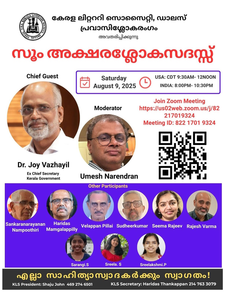 ഡാളസ്: ജൂലായ് 9 ശനിയാഴ്ച (രാവിലെ 9.30 സെന്റ്രൽ ടൈം) കേരളാ ലിറ്റററി സൊസൈറ്റി(കെഎല്എസ്സ്) അക്ഷരശ്ലോക സദസ്സ് സംഘടിപ്പിക്കുന്നു. അമേരിക്കയിലും, ഗൾഫിലും, കേരളത്തിൽ നിന്നുമുള്ള അക്ഷരശ്ലോക പ്രവീണർ പരിപാടിയിൽ പങ്കെടുക്കും. സദസ്സിലുള്ളവർക്കും പങ്കെടുക്കാവുന്ന ഹൈബ്രിഡ് രീതിയിലാണു ഈ അക്ഷരശ്ലോകസദസ്സ് ക്രമീകരിച്ചിരിക്കുന്നത്.