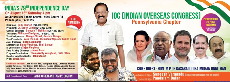 പ്രവാസി ഇന്ത്യൻ സമൂഹം എന്ന നിലയിൽ മഹാത്മാഗാന്ധി, ജവഹർലാൽ നെഹ്റു, സർദാർ വല്ലഭായ് പട്ടേൽ, സുഭാഷ് ചന്ദ്രബോസ്, മൗലാന ആസാദ്, ബി ആർ അംബേദ്കർ തുടങ്ങി ഇന്ന് നമ്മൾ ആസ്വദിക്കുന്ന ഇന്ത്യൻ സ്വാതന്ത്ര്യത്തിനും ജനാധിപത്യത്തിനും വഴിയൊരുക്കിയ ധീരരായ നേതാക്കളുടെയും മറ്റ് പ്രമുഖ വ്യക്തിത്വങ്ങളുടെയും ത്യാഗത്തെ ഓർമ്മിക്കാനും ആഘോഷിക്കാനുമുള്ള സമയമാണിതെന്നും ഈ ആഘോഷങ്ങളിലേക്ക് ഏവരെയും സ്വാഗതം ചെയ്യുന്നതായും ഐ. ഒ. സി. കേരള ചാപ്റ്റർ പെൻസിൽവാനിയ ഘടകം ഭാരവാഹികൾ അറിയിച്ചു. അത്താഴ വിരുന്നോടു കൂടിയായിരിക്കും പരിപാടികൾ സമാപിക്കുക. പ്രവേശനം തികച്ചും സൈജന്യമായിരിക്കും.
