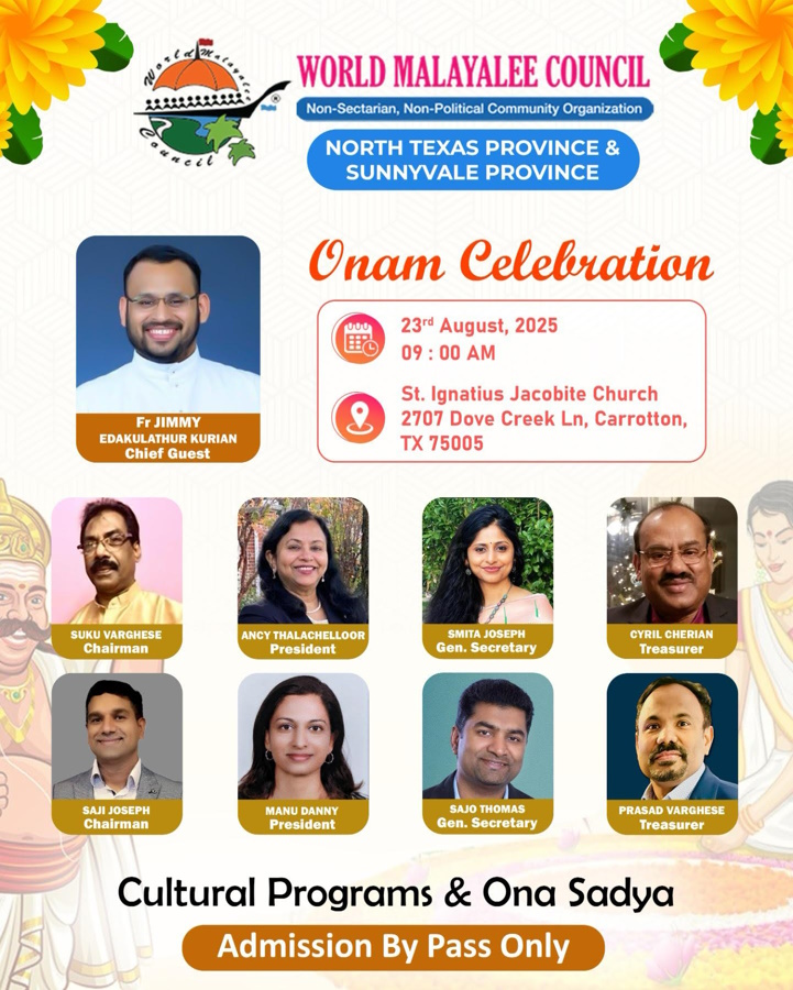 ഡാളസ് : വേൾഡ് മലയാളീ കൗൺസിൽ നോർത്ത് ടെക്സാസ് പ്രൊവിൻസും, സണ്ണിവെയിൽ പ്രൊവിൻസും സംയുക്തമായി സംഘടിപ്പിക്കുന്ന ഓണാഘോഷം ഓഗസ്റ്റ് 23 ശനിയാഴ്ച ഡാലസിൽ നടക്കും.