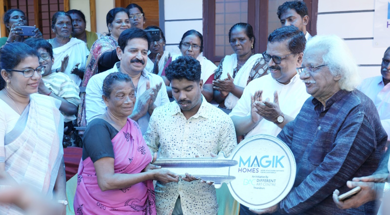 വക്കം/തിരുവനന്തപുരം: 27 വര്ഷം നീണ്ട വാടകവീട്ടിലെ ദുരിതജീവിതത്തിന് വിരാമം. ചലനപരിമിതയായ ഇന്ദിരയും ബൗദ്ധികപരിമിതിയുള്ള മകന് രാഹുലും ഇനി സുരക്ഷിതത്വത്തിന്റെ തണലില്. ഡിഫറന്റ് ആര്ട് സെന്ററിന്റെ (ഡി.എ.സി) ‘മാജിക് ഹോം’ പദ്ധതിയുടെ ഭാഗമായി നിര്മിച്ച അഞ്ചാമത്തെ വീടിന്റെ താക്കോല് വക്കം അടിവാരത്ത് വച്ച് ഇവര്ക്ക് കൈമാറി. നിറകണ്ണുകളോടെയാണ് ഇന്ദിര പുതിയ ജീവിതത്തിലേക്ക് കടന്നു കയറിയത്.