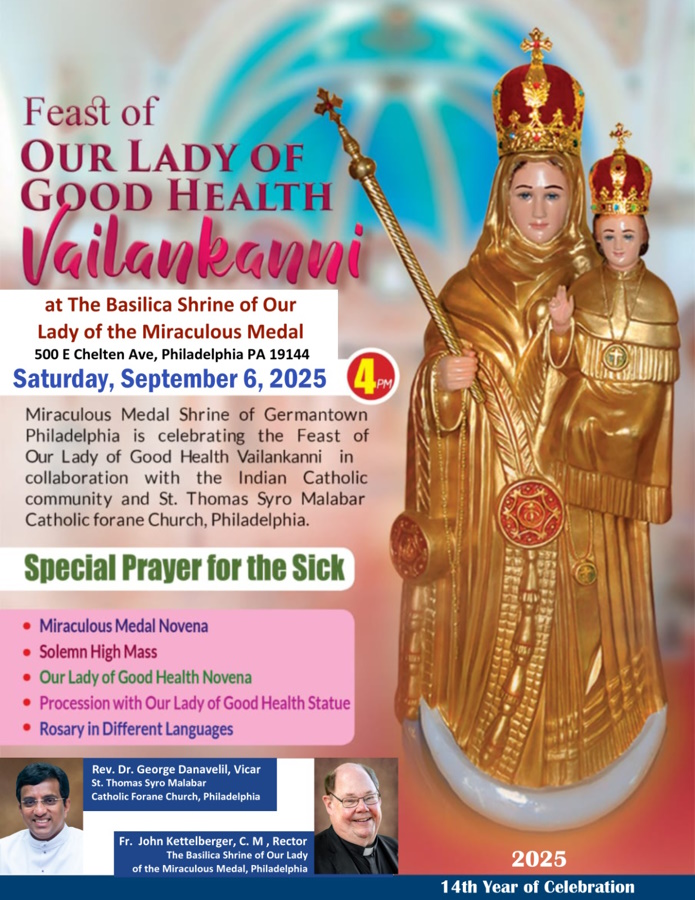 എട്ടുനോമ്പിനോടനുബന്ധിച്ച് ആണ്ടുതോറും നടത്തിവരുന്ന പ്രാര്ത്ഥനാപൂര്ണമായ മരിയന്തീര്ത്ഥാടനവും വേളാങ്കണ്ണി മാതാവിന്റെ തിരുനാളും പൂര്വാധികം ഭക്തിപുര്വം ഈ വര്ഷം സെപ്റ്റംബര് 6 ശനിയാഴ്ച ആഘോഷിക്കപ്പെടുന്നു. ജര്മ്മന്ടൗണിനു തിലകമായി നിലകൊള്ളുന്ന മിറാക്കുലസ് മെഡല് തീര്ത്ഥാടനകേന്ദ്രത്തില്(The Basilica Shrine of Our Lady of the Miraculous Medal; 475 E. Chelten Avenue, Philadelphia, PA 19144)തുടര്ച്ചയായി ഇതു പതിനാലാം വര്ഷമാണു വേളാങ്കണ്ണി മാതാവിന്റെ തിരുനാള് ഭക്തിപൂര്വം ആഘോഷിക്കപ്പെടുന്നത്. വിവിധ ഇന്ഡ്യന് ക്രൈസ്തവ സമൂഹങ്ങളുടെയും, ഫിലാഡല്ഫിയാ സീറോ മലബാര് ഫൊറോനാ പള്ളിയുടെയും സഹകരണത്തോടെ മിറാക്കുലസ് മെഡല് തീര്ത്ഥാടനകേന്ദ്രമാണു തിരുനാളിനു നേതൃത്വം നല്കുന്നത്.