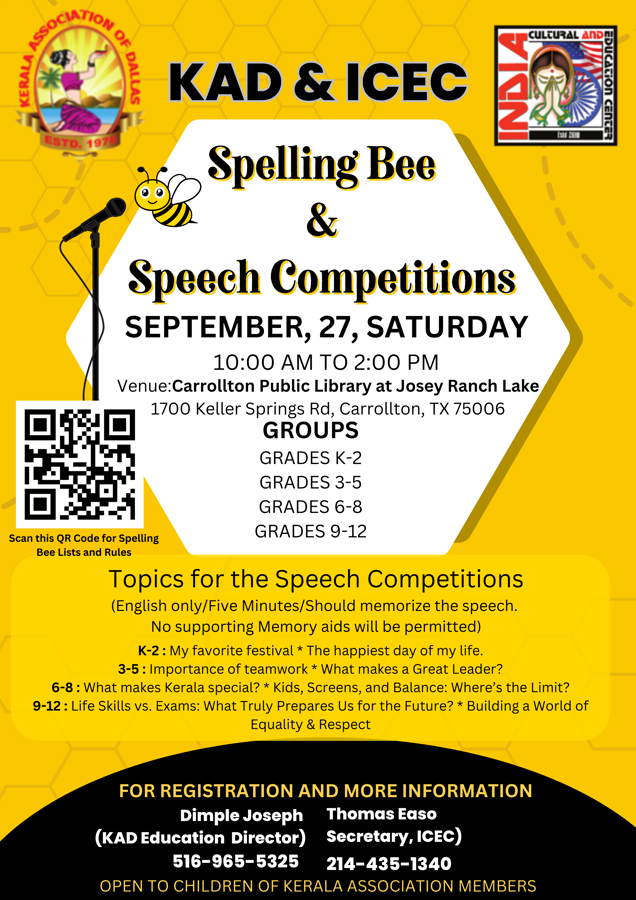 ഡാലസ്: കേരള അസോസിയേഷൻ ഓഫ് ഡാലസും (KAD) ഇന്ത്യാ കൾച്ചറൽ ആൻഡ് എജ്യുക്കേഷൻ സെന്ററും (ICEC) സംയുക്തമായി കുട്ടികൾക്കായി സ്പെല്ലിംഗ് ബീ, പ്രസംഗ മത്സരങ്ങൾ സംഘടിപ്പിക്കുന്നു. സെപ്റ്റംബർ 27 ശനിയാഴ്ച രാവിലെ 10 മുതൽ ഉച്ചയ്ക്ക് 2 വരെ കാർൾട്ടൺ പബ്ലിക് ലൈബ്രറിയിലാണ് മത്സരങ്ങൾ നടക്കുക.