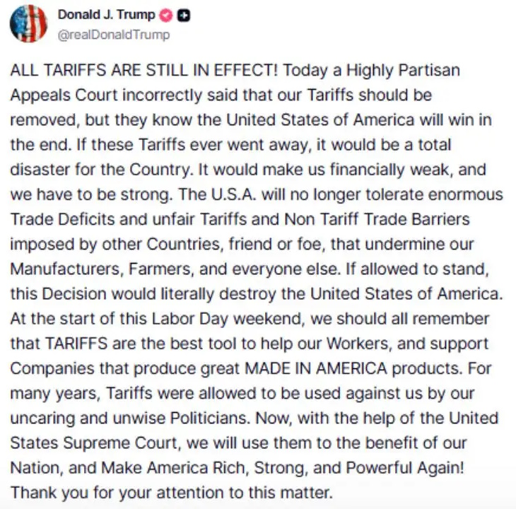 കോടതി തീരുമാനം ഒക്ടോബർ 14 വരെ നീട്ടിവച്ചു കൊണ്ട് സുപ്രീം കോടതിയിൽ അപ്പീൽ നൽകാൻ ട്രംപിന്റെ ടീമിന് സമയം നൽകി. ട്രംപ് തന്റെ സോഷ്യൽ മീഡിയ പ്ലാറ്റ്ഫോമായ ട്രൂത്ത് സോഷ്യലിൽ ഈ തീരുമാനത്തെ വിമർശിച്ചു. കോടതി പക്ഷപാതപരമാണെന്ന് ട്രംപ് വിശേഷിപ്പിച്ചു. താരിഫ് നീക്കം ചെയ്യുന്നത് യുഎസ് സമ്പദ്വ്യവസ്ഥയ്ക്ക് വിനാശകരമാകുമെന്ന് അദ്ദേഹം മുന്നറിയിപ്പ് നൽകി. അതേസമയം, താരിഫുകൾ നിലനിൽക്കുമെന്നും കേസിൽ അദ്ദേഹം വിജയിക്കുമെന്ന് പ്രതീക്ഷിക്കുന്നതായും വൈറ്റ് ഹൗസ് വക്താവ് കുഷ് ദേശായി പറഞ്ഞു.