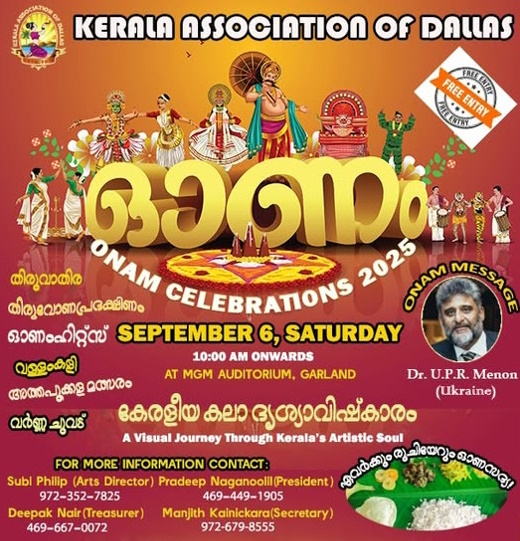 കൂടുതൽ വിവരങ്ങൾക്ക്: പ്രദീപ് നാഗനൂലിൽ (പ്രസിഡന്റ്) 469-449-1905, മഞ്ജിത് കൈനിക്കര (സെക്രട്ടറി) – 972-679-8555, സുബി ഫിലിപ്പ് (ആർട്ട്സ് ഡയറക്ടർ) – 972-352-7825.