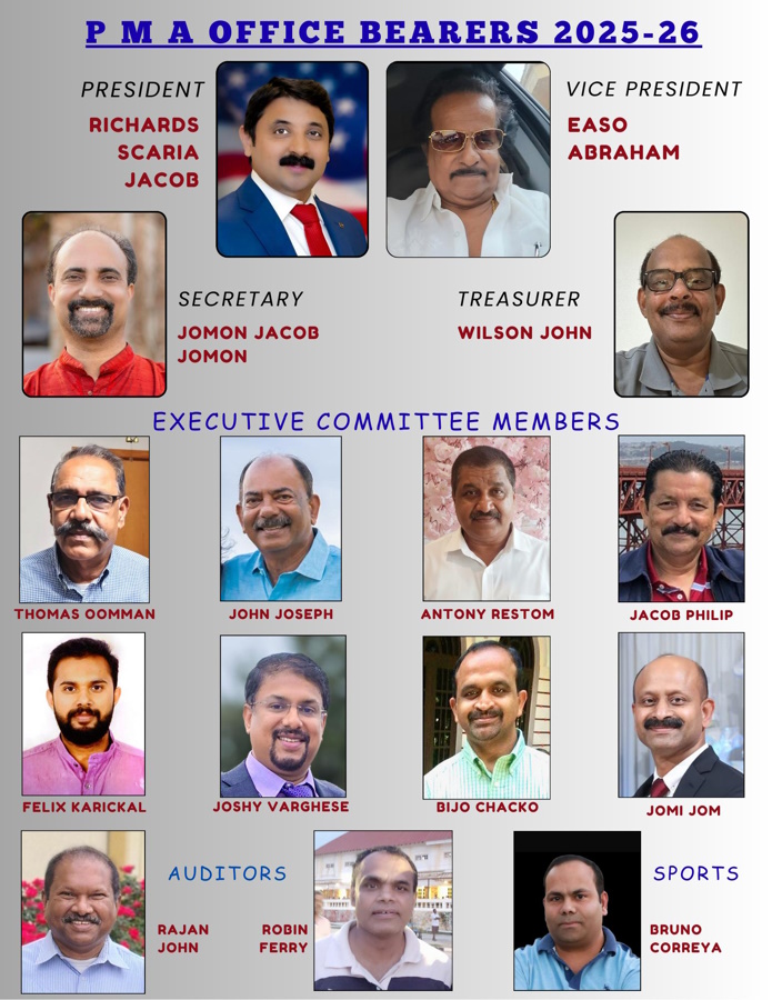 ഹൂസ്റ്റൺ : 1980കളിൽ ആരംഭിച്ച് നാളിതുവരെ 350ൽ പരം സാധു കുടുംബങ്ങൾക്ക് ചികിത്സാ സഹായം നൽകി മുന്നേറുന്ന ഹൂസ്റ്റണിലെ പ്രമുഖ മലയാളി കൂട്ടായ്‌മകളിലൊന്നായ പാസഡീന മലയാളി അസോസിയേഷൻ (PMA) ഇക്കഴിഞ്ഞ ദിവസം നടത്തപ്പെട്ട പിക്നിക്കിനോനുബന്ധിച്ച് 2025-26 പ്രവർത്തന വർഷത്തേക്കുള്ള ഭാരവാഹികളെ തിരഞ്ഞെടുത്തു.