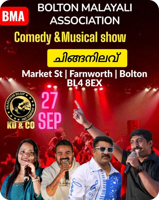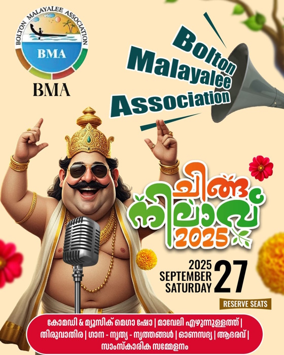 ബോൾട്ടൻ: യു കെയിലെ മലയാളി സമൂഹത്തിന്റെ പ്രബല സംഘടനകളിൽ ഒന്നായ ബോൾട്ടൻ മലയാളി അസോസിയേഷൻ (ബി എം എ) – ന്റെ ഈ വർഷത്തെ ഓണഘോഷ പരിപാടി ‘ചിങ്ങനിലാവ് 2025’ സെപ്റ്റംബർ 27, ശനിയാഴ്ച വിപുലമായി സംഘടിപ്പിക്കും.