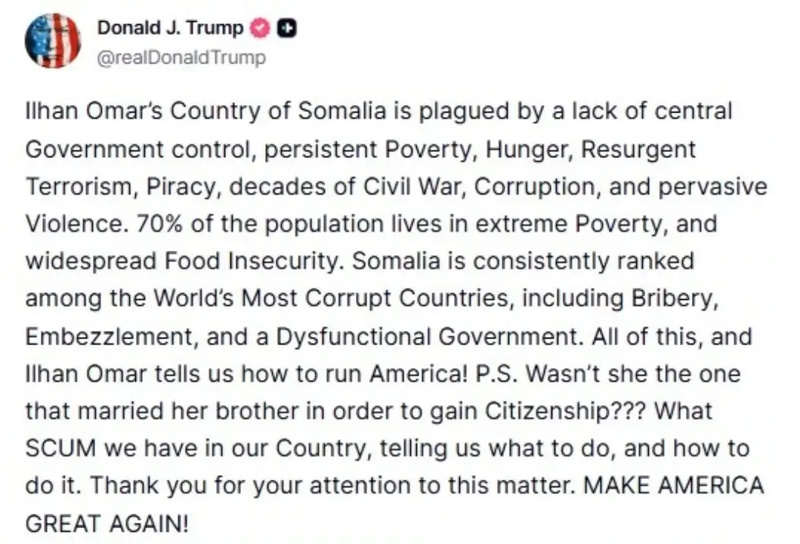 “ദാരിദ്ര്യവും പട്ടിണിയും ഭീകരതയും അഴിമതിയും” നിറഞ്ഞ ഒരു രാജ്യത്ത് നിന്നാണ് അവർ വരുന്നതെന്നും അതിനാൽ യുഎസ് നയത്തെക്കുറിച്ചും ദിശാബോധത്തെക്കുറിച്ചും ഉപദേശിക്കാൻ അവർക്ക് അവകാശമില്ലെന്നും ഒമറിന്റെ പ്രസ്താവനകളെ ട്രംപ് എതിർത്തു. ലോകമെമ്പാടും നിന്ന് അവർക്ക് വോട്ട് ചെയ്യാൻ ആളുകൾ എത്തിയിരിക്കാമെന്ന് പറഞ്ഞ ട്രംപ്, ഒമറിന്റെ തിരഞ്ഞെടുപ്പ് വിജയത്തെയും ചോദ്യം ചെയ്തു.
